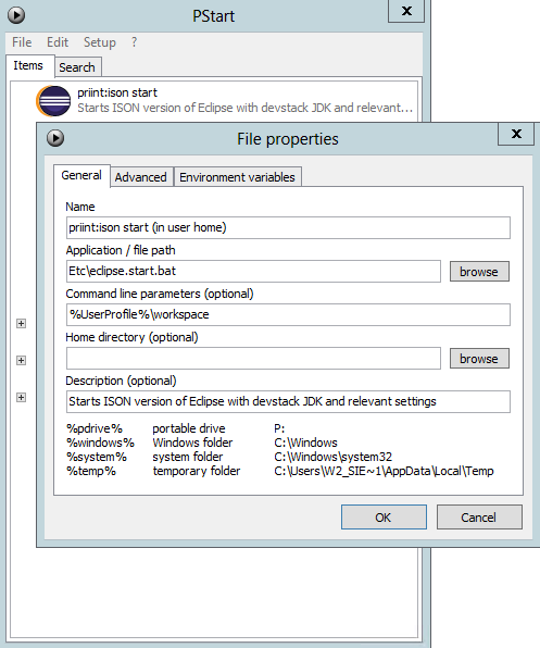 Open PStart window for that, and use the command “****Edit->Add file…” or “Edit->Edit…”. In a new entry select etc\eclipse.start.bat as application. In File properties change “Name