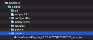 open the folder where you have copied Eclipse, right-click on Eclipse.app and select “Show package content” from the popup menu. Open the folder Contents/Eclipse/dropins