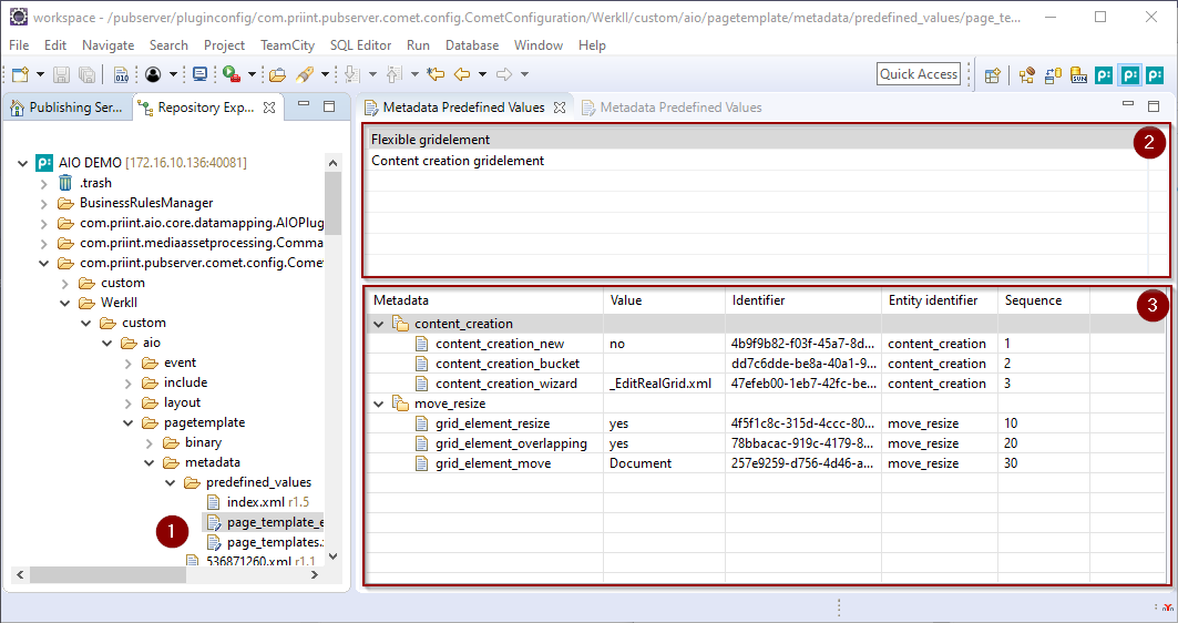 The command Edit Metadata Predefined Values is found in the context menu of each configuration file for predefined metadata in Repository Explorer, in the folder com.priint.pubserver.comet.config.CometConfiguration/<tenant>/custom/<comet project>/pagetemplate/metadata/predefined_values for the files page_templates.xml and page_template_elements.xml.