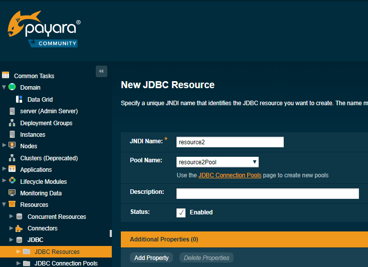 - Last but not least he creates a new JDBC Resource for the pool from step 2 - e.g. call “resource2”: