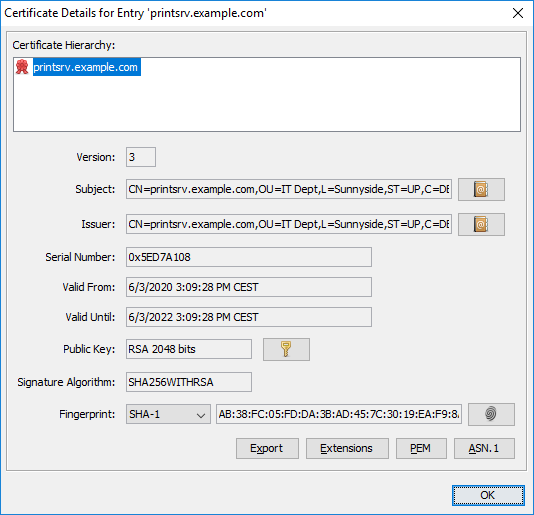 Open the certificate file you got in KeyStore Explorer. For our example here we use the file “printsrv.example.com.p12”. (KeyStore Explorer allows other file formats as well, like PEM or CRT etc.) KeyStore explorer will normally ask for a password. The password Is typically sent together with the certificate file. If not, ask the customer IT that created the certificate.