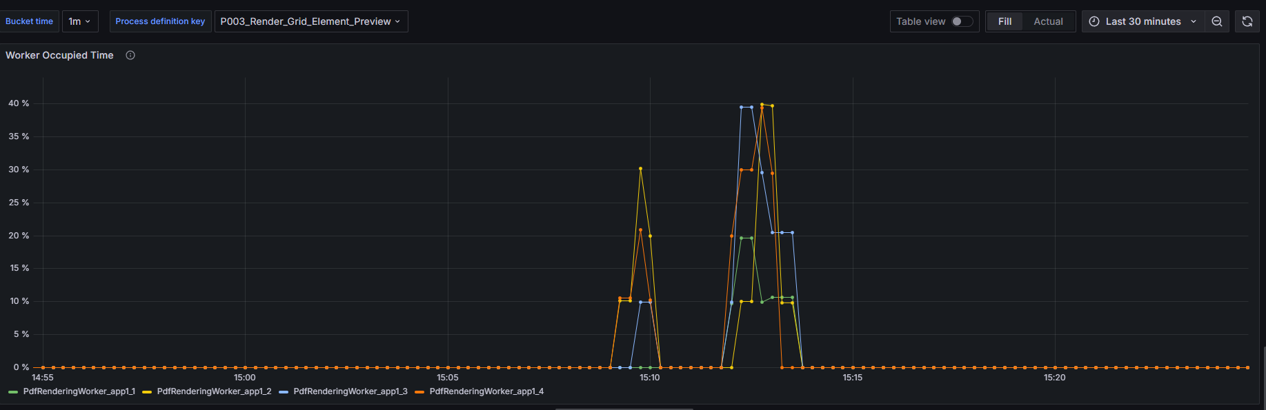 The dashboard includes a bucket setup with time periods ranging from 1 minute up to 24 hours. This allows you to view the worker occupied time metric over different durations to analyze performance trends.