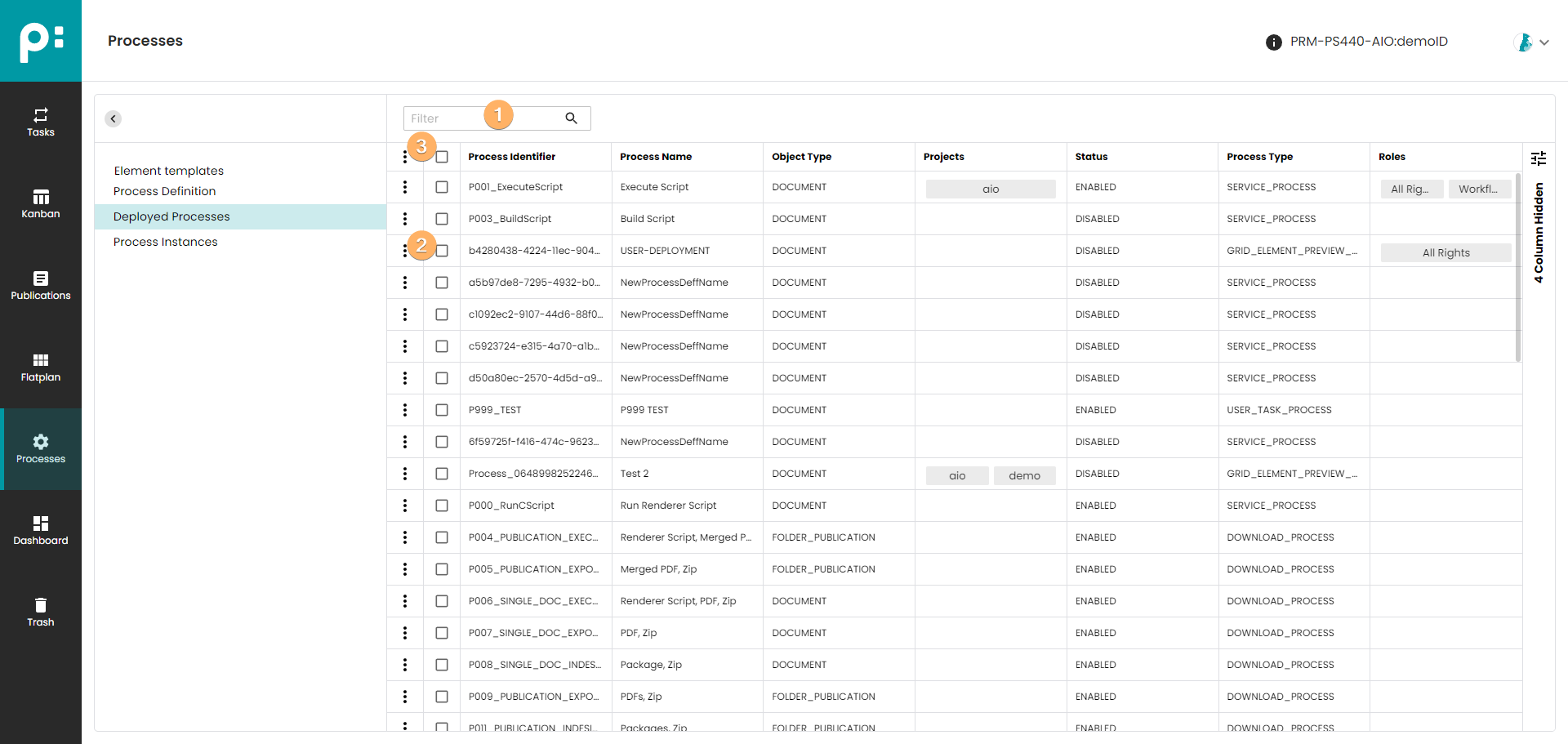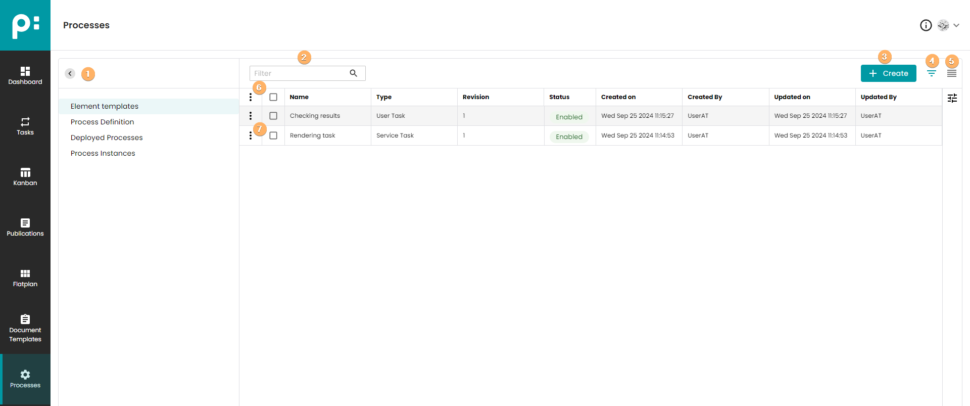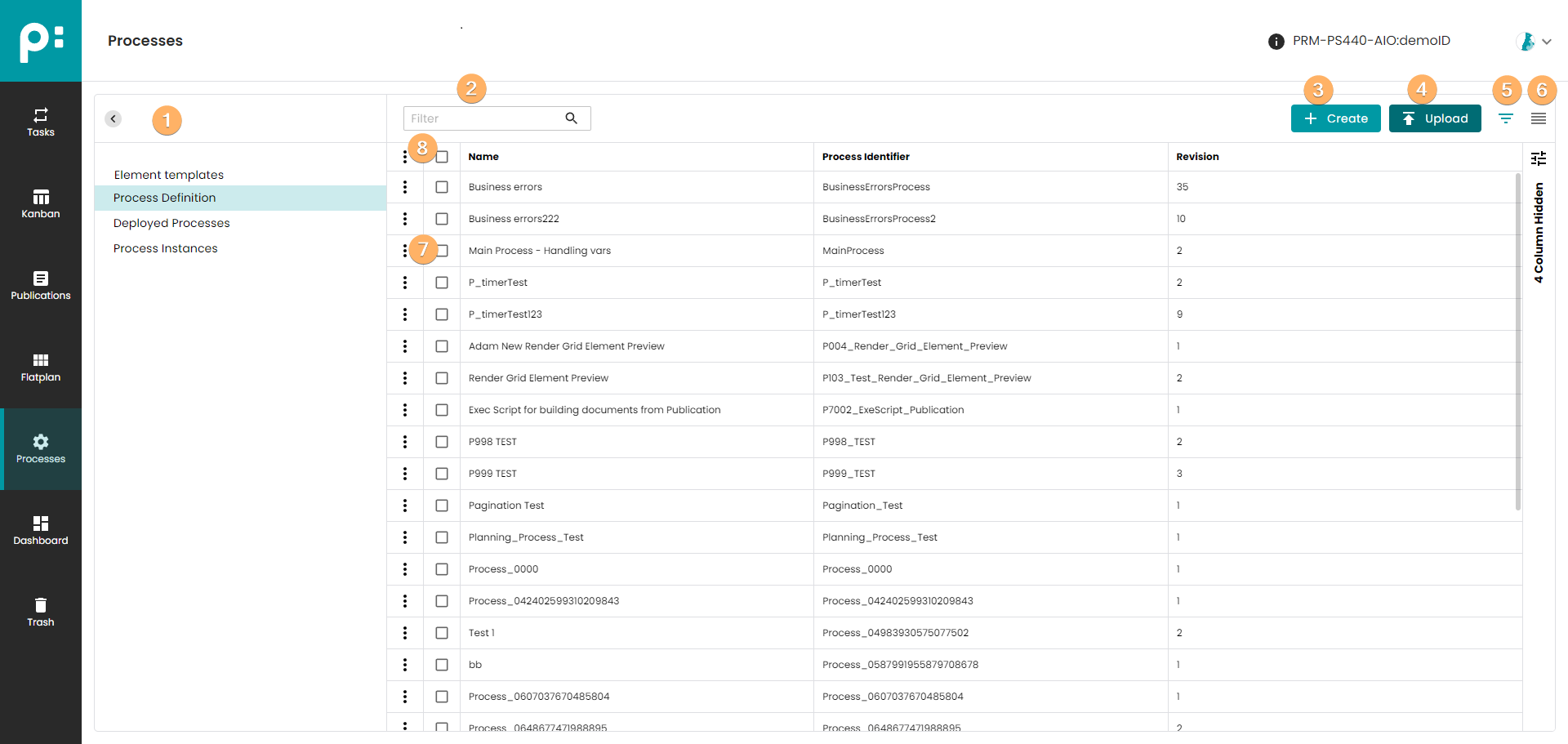 The Process Definition grid allows for creating, uploading and editing processes. Every time the user saves a process, a new revision will be created.