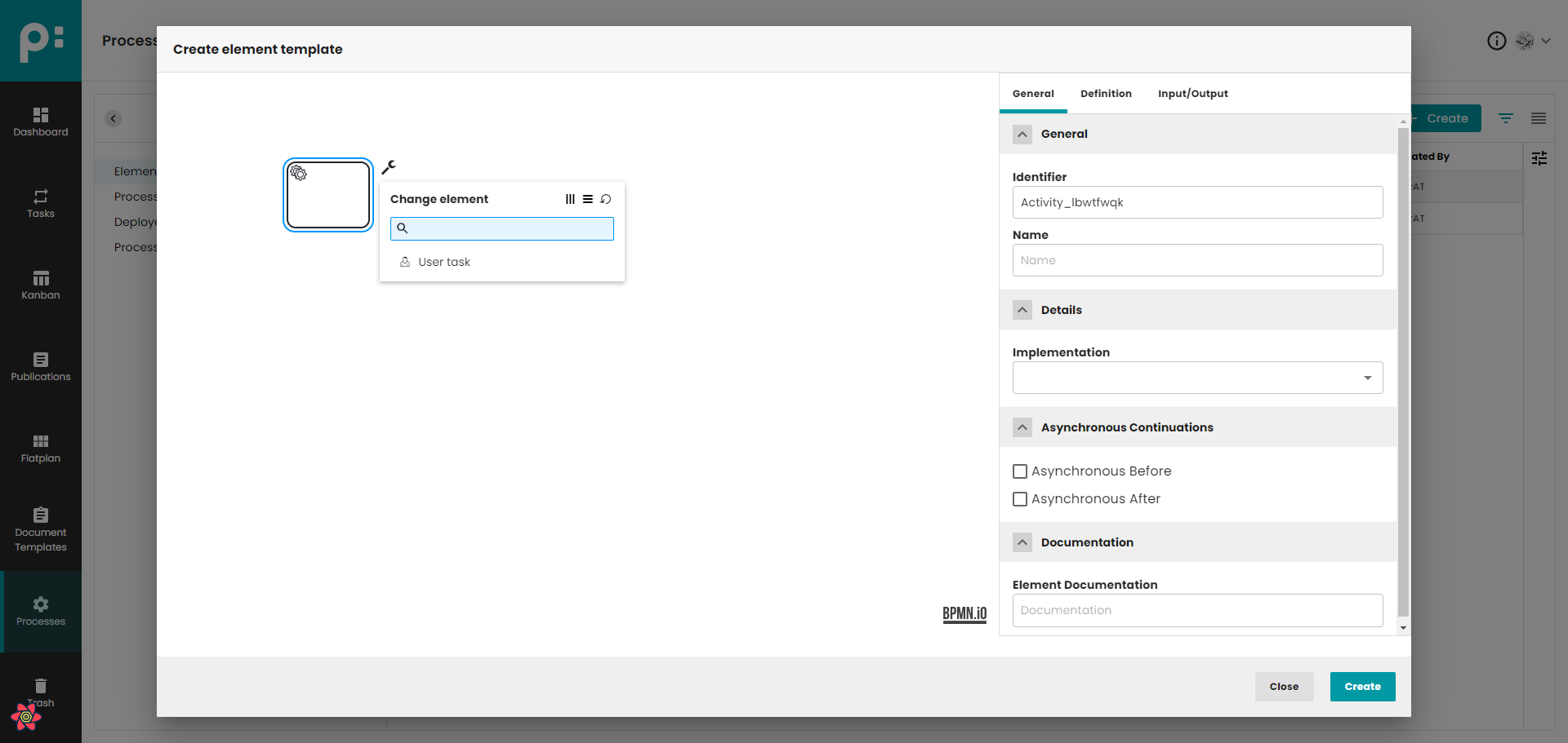 - Create a new element template by clicking the Create button. The template editor explained below will open with a service task event only.