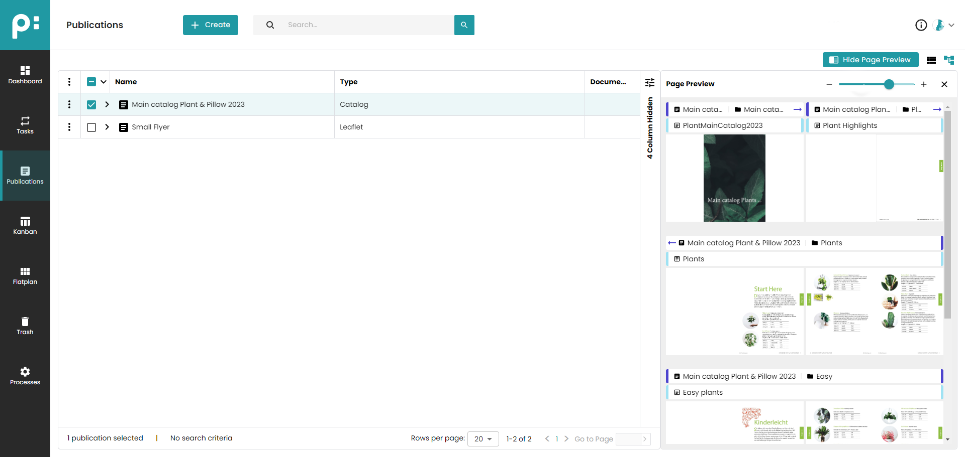 If the user selects publications, folders or documents, the Preview panel is available. By clicking on the "Show Page Preview" button the preview panel on the right side opens. The document pages are displayed. Zooming is done via the zoom selector. Its setting defines how many columns are displayed. You can vary between four (-) and one (+), the size of the preview is adjusted. Clicking the x button or the "Hide Page Preview" button closes the preview.