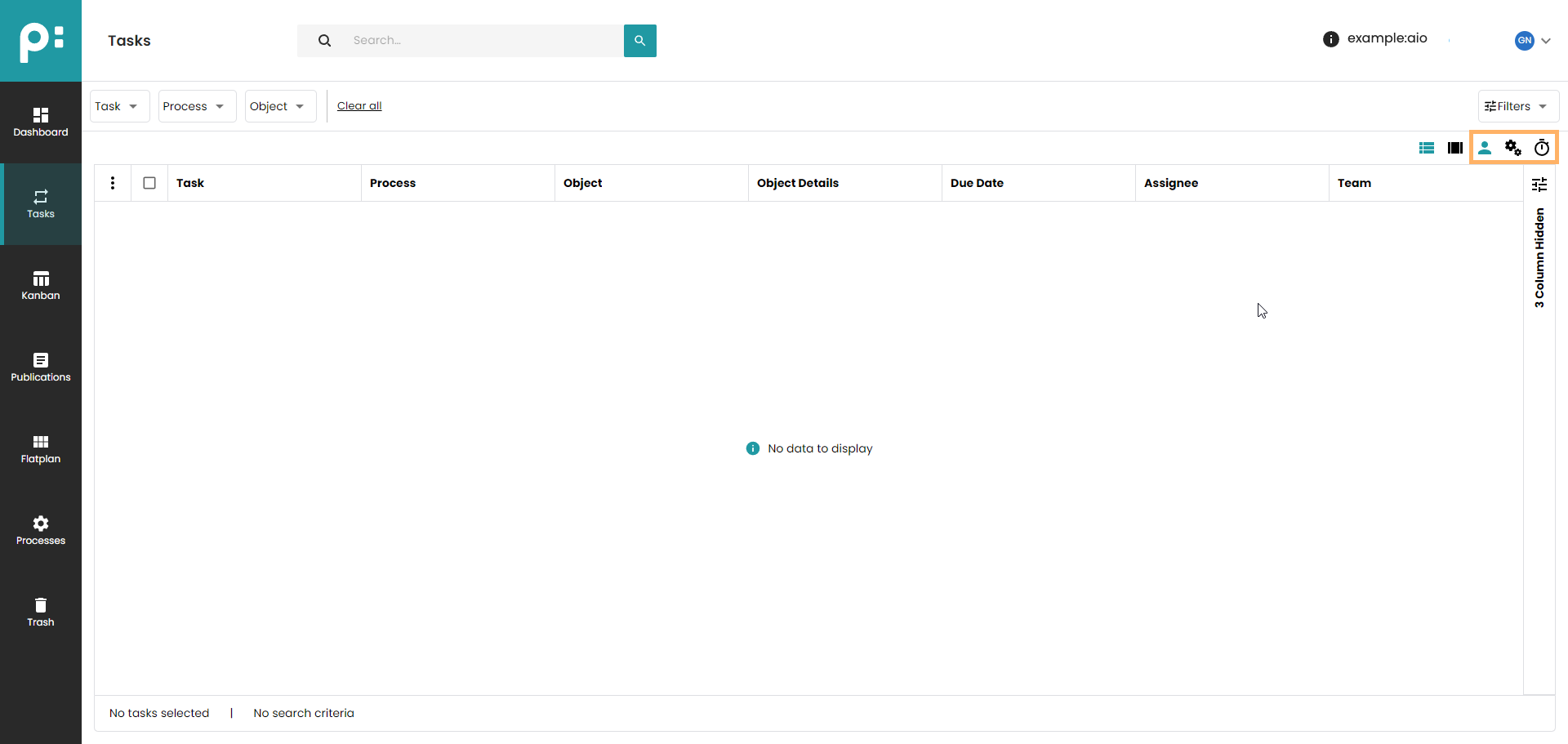 - The search filters the tasks by the task name. With an empty search field every task relevant for the current user is displayed. For more detailed filtering, please use the standard filter functionality below the search bar.