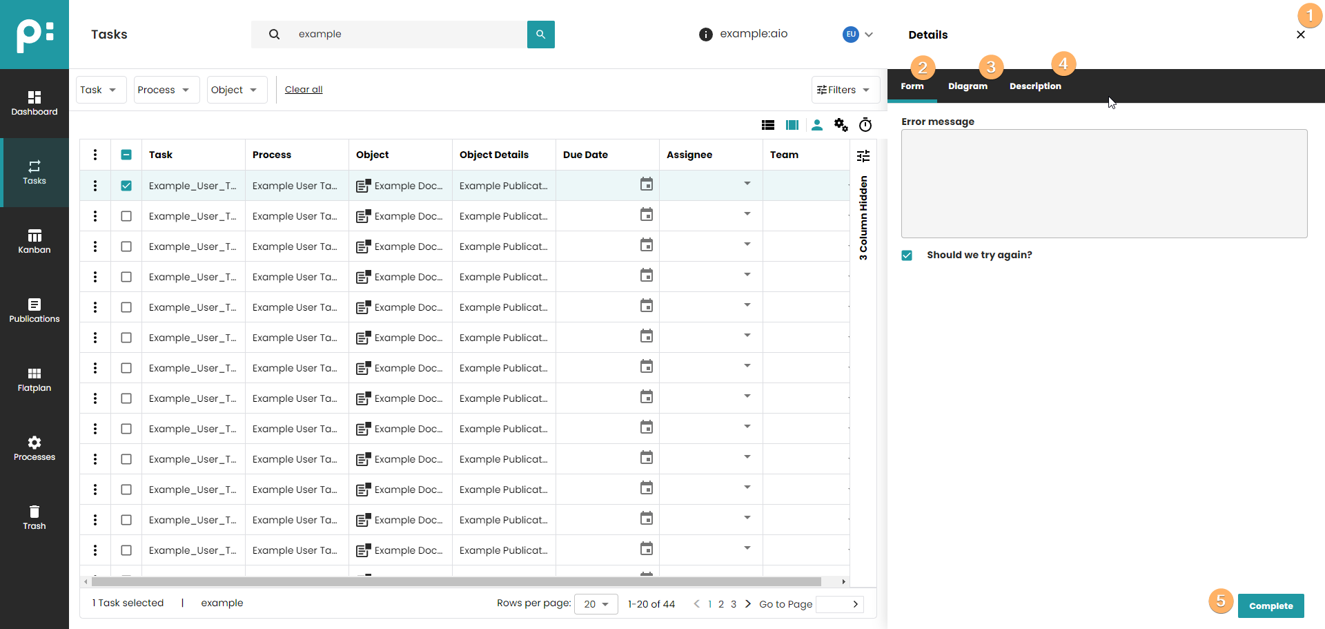 - The tab Form always contains a Complete button, for telling the system that the user task was completed. Do not click accidentally. Completing a task will let the process go on.