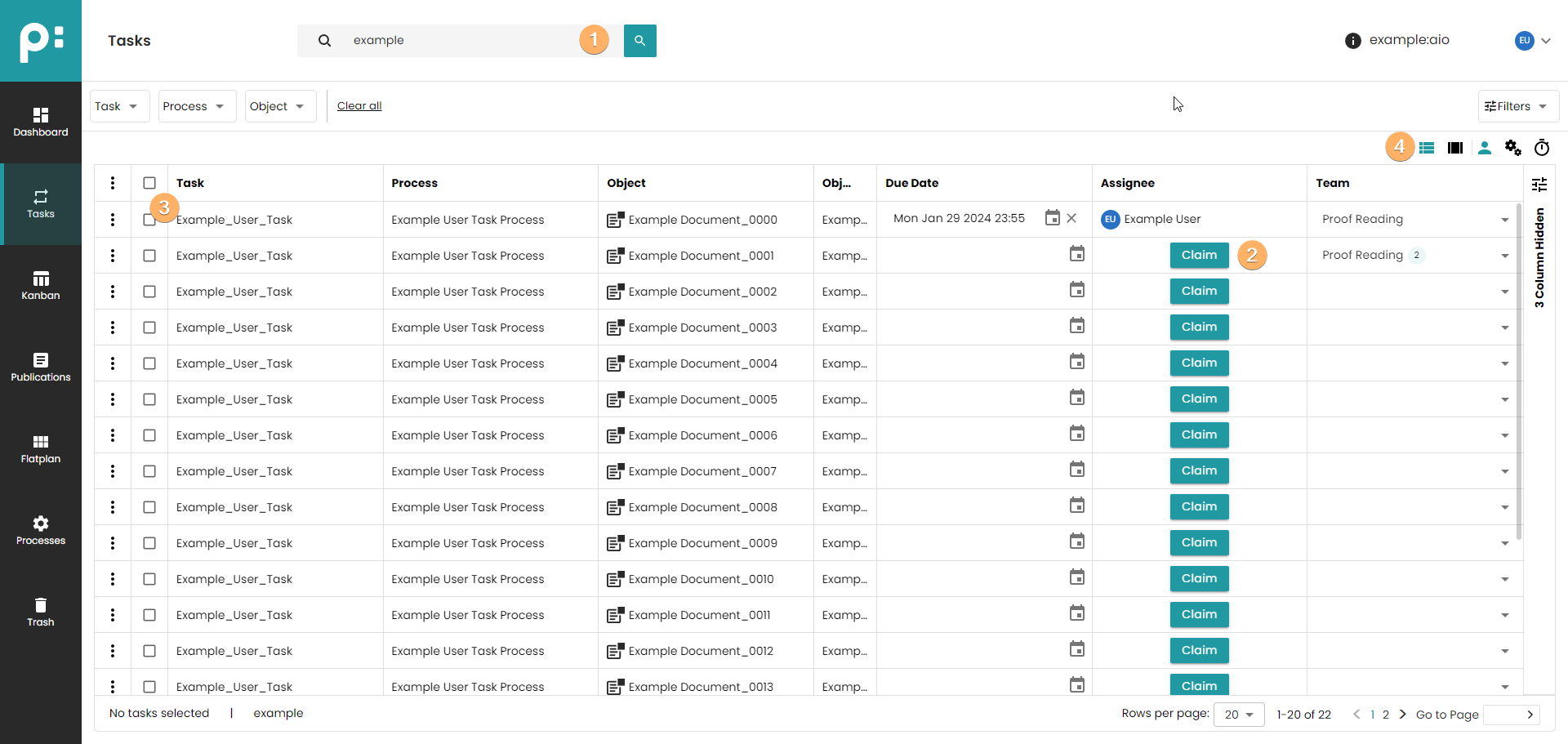 - Tasks which have no assignee yet can be claimed by the current user. This should be done before starting the actual work on the task.